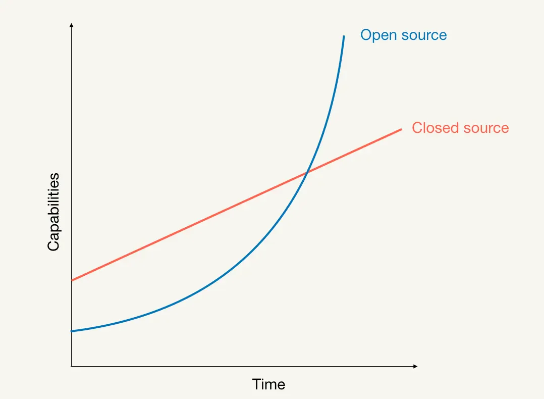 Closed source proprietary foundation models have been outperforming open source models so far, but this main advantage is diminishing quickly. While proprietary models were more capable than open source models at first, open source models have become more advanced, and the performance gap is closing quickly. This is because the barrier to entry for training and experimentation has dropped from large research organizations to smaller research institutions and even to individuals. Because cost-efficient fine-tuning strategies, such as Low-Rank Adaptation (LoRA), have been developed, making high-quality foundation models publicly available makes it possible for almost anyone with an idea, some time, and a performant laptop to generate and distribute a new variant of it.