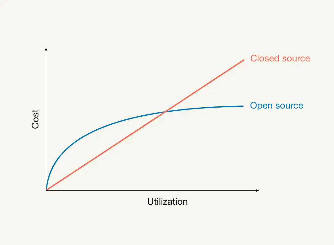On the other hand, the inferencing costs for proprietary models increase linearly with utilization. Being exposed to the risk of unexpected changes in pricing policy could also be a reason why enterprises often want to avoid lock-in with closed source model providers, according to the a16z survey [1]. While “getting an accurate answer is worth the money,” as one respondent in the a16z survey [1] stated, it is clear that proprietary models will become less attractive when free, unrestricted alternatives are available.