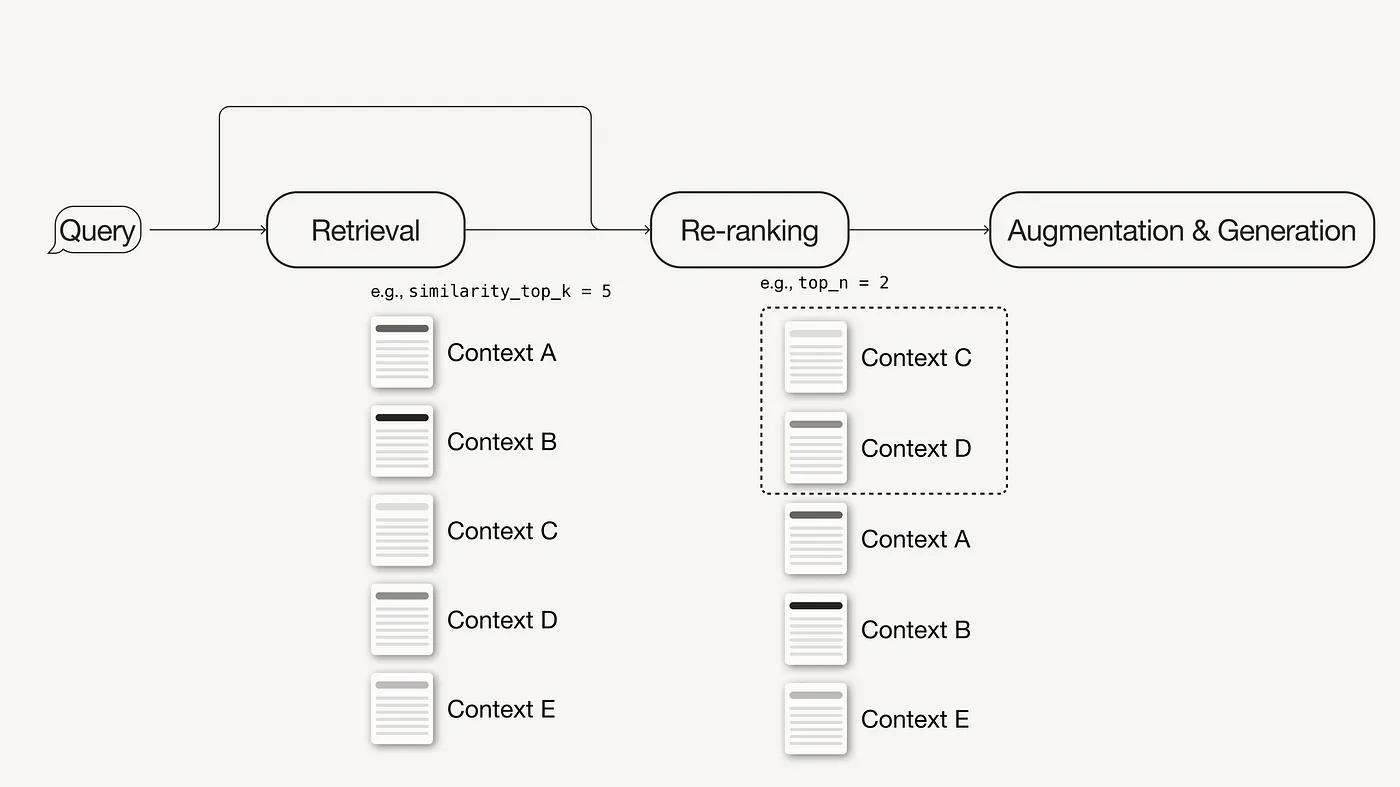 - Re-ranking uses machine learning models to recalculate the relevance scores of the retrieved contexts.