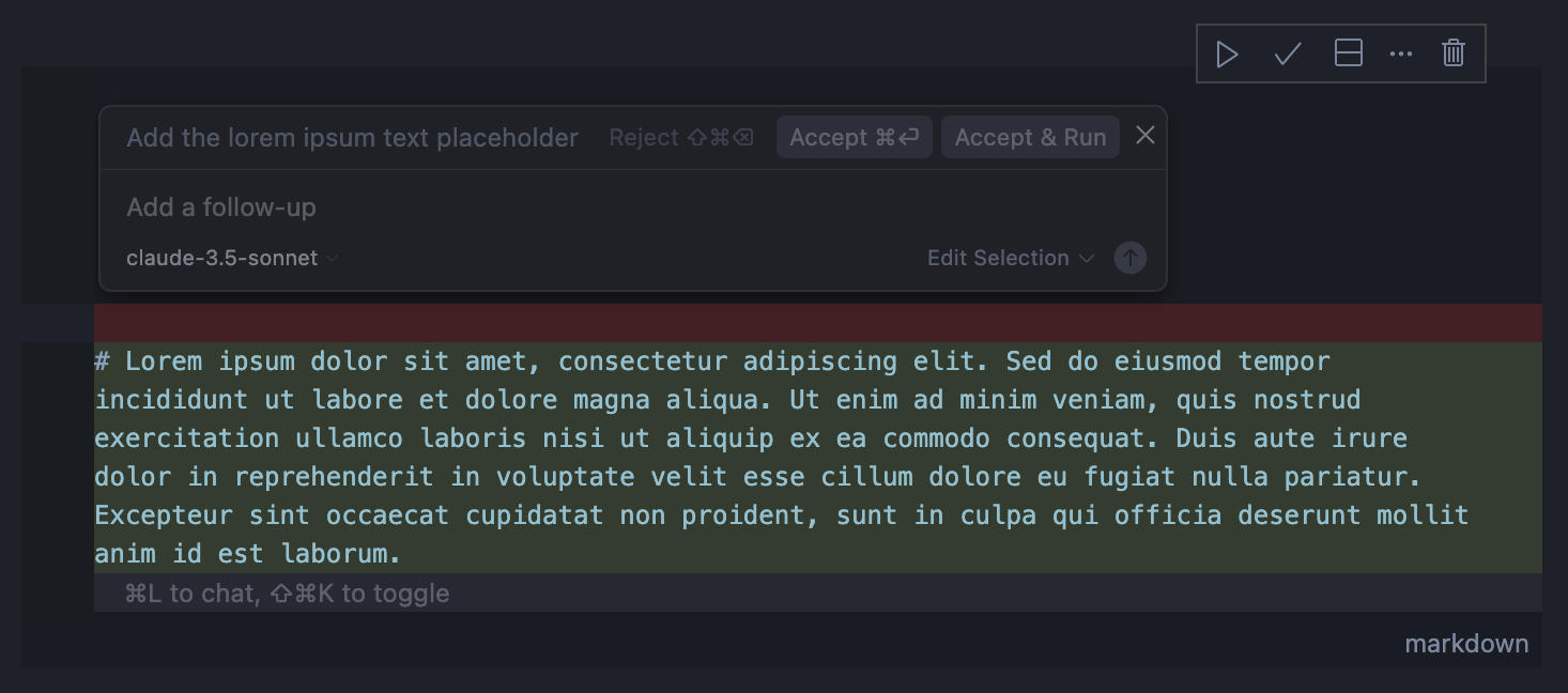 What works somewhatis that, alternatively, if you’re using something like Cursor, you can select a cell and have an AI assistant edit its contents with Command + K. However, I noticed that when prompting it to add text, it would always add a hash symbol before a text cell. This is not ideal because that means you have to manually remove the hash symbol - otherwise, your text is rendered as a heading.