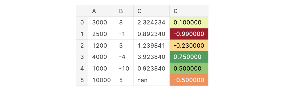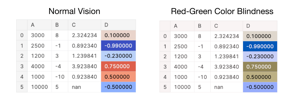 Let’s have a look at an example of an ineffective data visualization due to its color palette. On the first look, the below data visualization looks effective for showcasing how positive or negative a value in column D is. This is a popular method to indicate positive vs. negative or even good vs. bad since we often associate the color green with “good” and the color red with “danger”. For people with an unimpaired vision, it is clear that row 1 has the largest negative value with -0.99 and that row 3 has the largest positive value with 0.75.