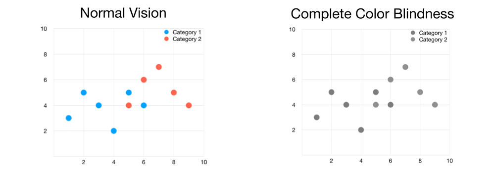 Even if your audience has no visual deficiency, black-and-white printing can have a similar effect on your data visualization as someone with complete color blindness (yes, people are still printing).