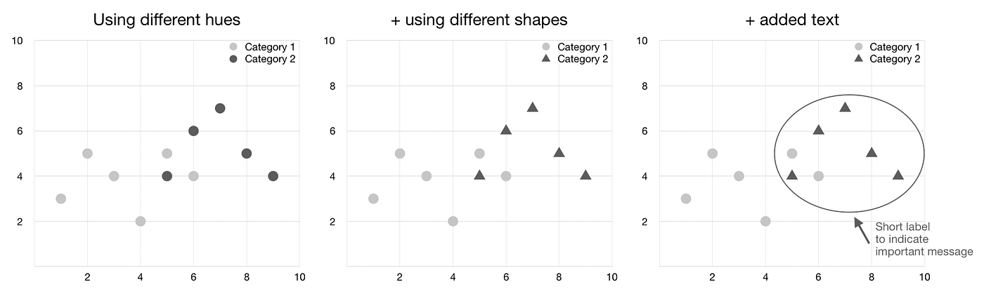 With these three strategies, the readability of the data visualization increases for people with color blindness and black-and-white printing.