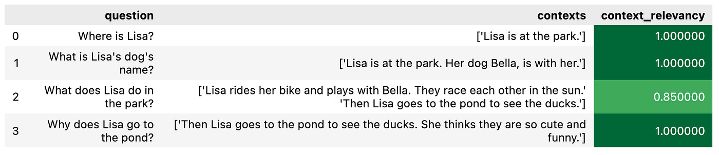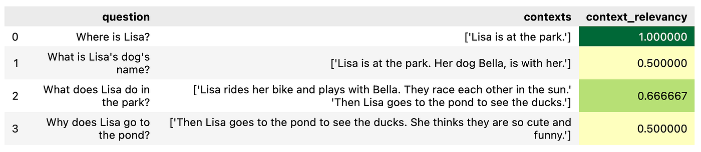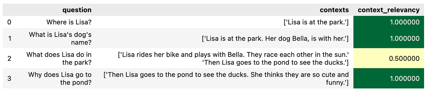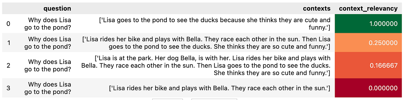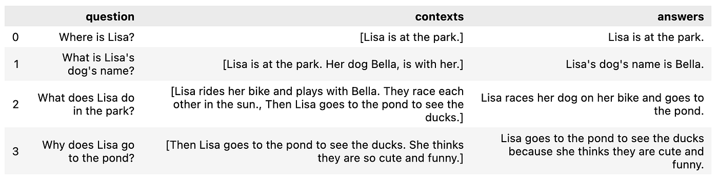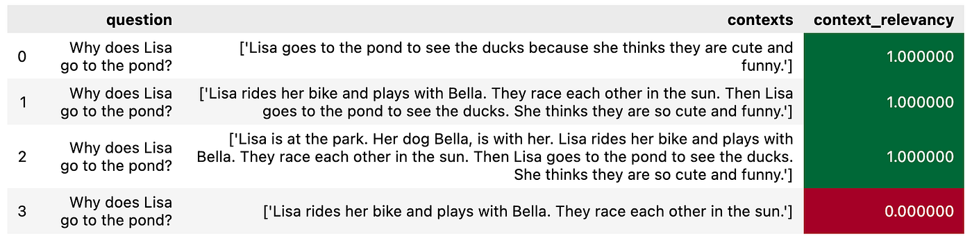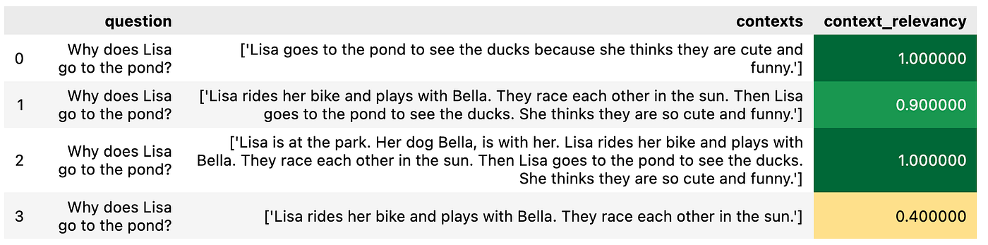 The second DataFrame contains different contexts for the question “Why does Lisa go to the pond?”. The first three contexts all contain the relevant information but with varying amounts of “clutter” information. The last context is entirely irrelevant to the question.