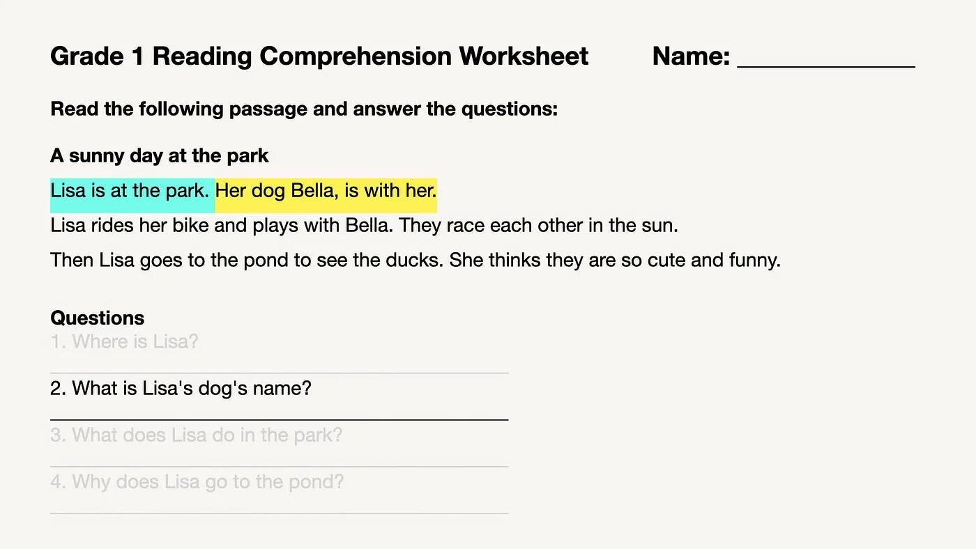 For example, to answer the question, “Where is Lisa?”, you only require the information “Lisa is at the park.” The remaining text is irrelevant to the question.