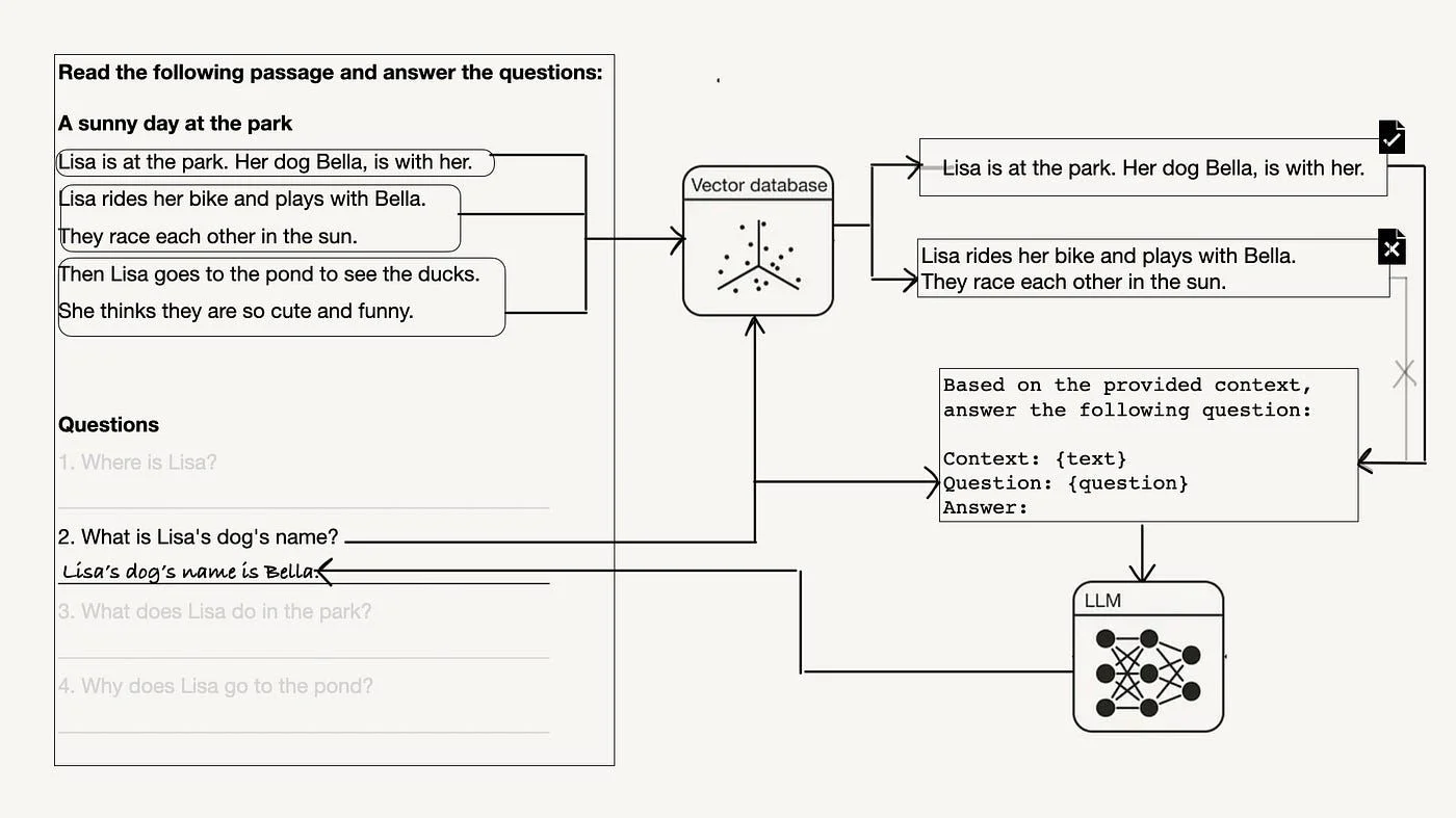 ]Note that state-of-the-art LLMs, such as gpt-3.5-turbo, can easily answer this 1st graders’ exercise if you pass the entire text as context since it is only six sentences long.