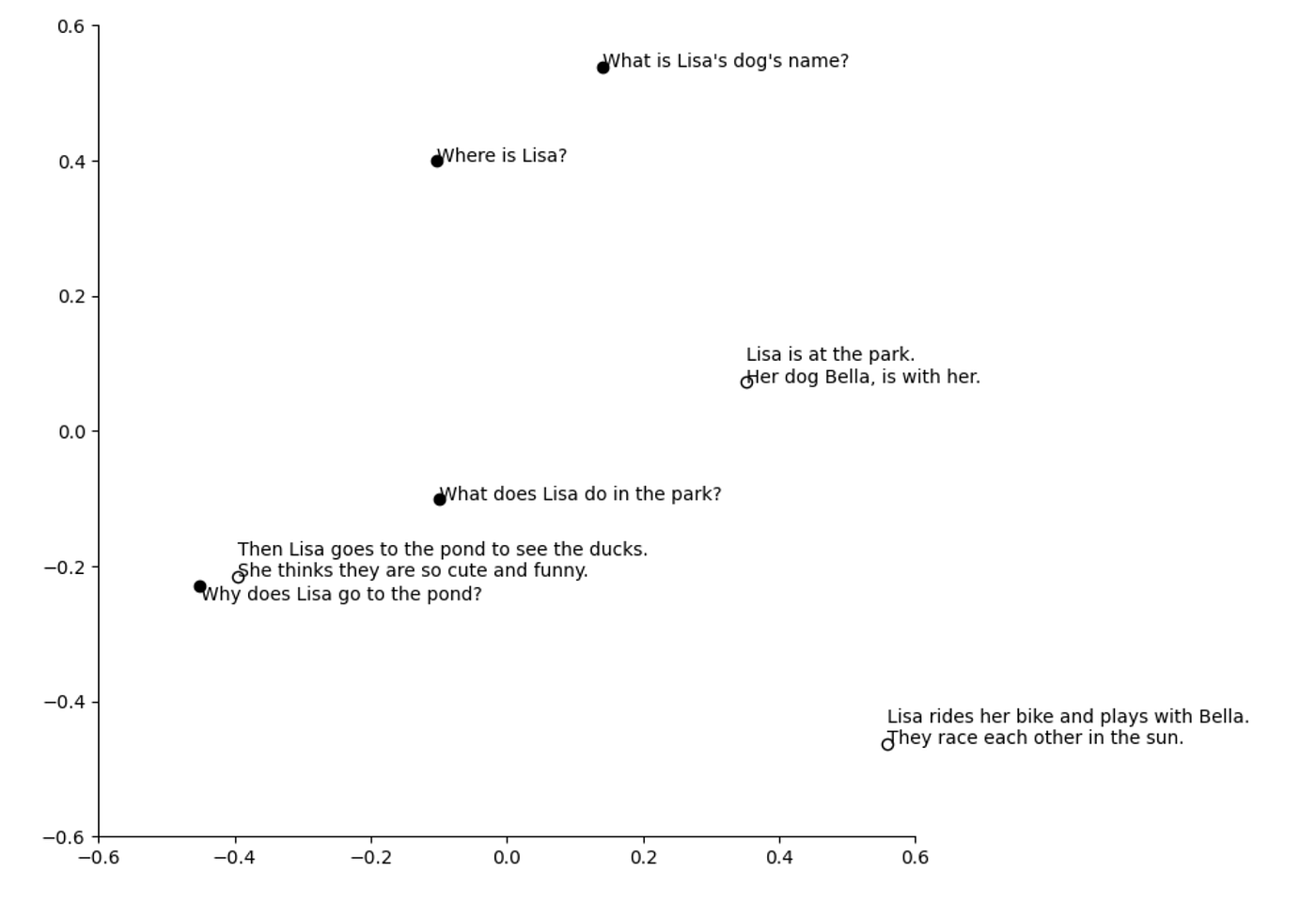 Below, you can see a 2-dimensional visualization (using PCA) of the questions and document chunks embedded with OpenAI’s text-embedding-3-small embedding model. In this vector space, you can see that the closest context chunk to the question “Why does Lisa go to the pond?” is “Then Lisa goes to the pond to see the ducks. She thinks they are so cute and funny.”, which would be the most relevant context for the user query.