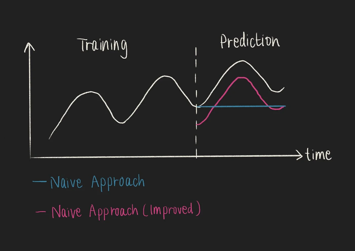 You can improve the naive approach by referencing the last cycle if you have a cyclical time series. For example, if your time series depends on the weekday, you can take the last month, group by the weekday, and take the average [2].