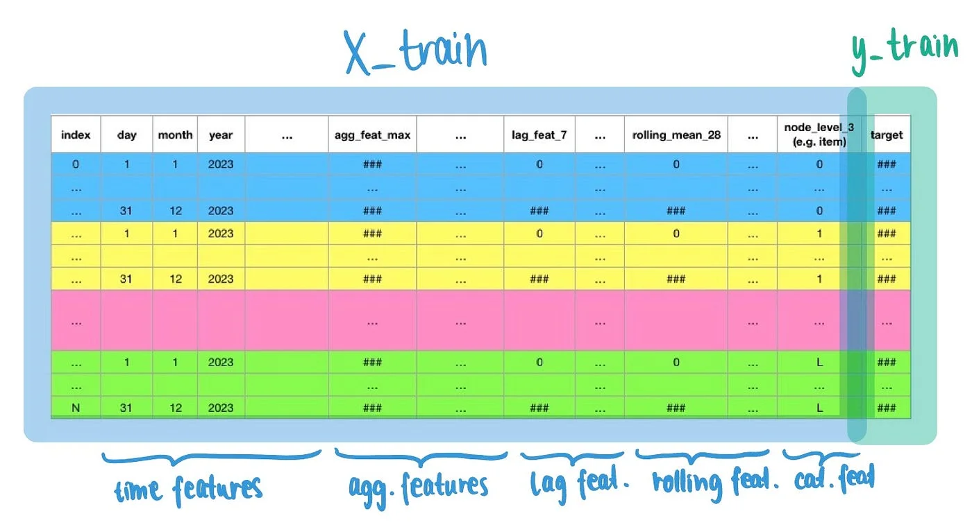 df[f"rolling_mean_{window}"] = df.groupby(LEVEL)[FEATURE].transform(lambda x : x.rolling(window).mean()).fillna(0)Hierarchy as categorical features