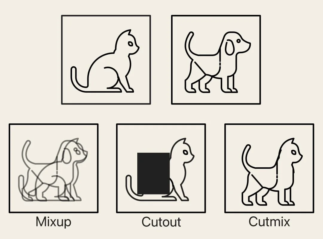 While Cutout applies the augmentation to a single image, Mixup and Cutmix create a new image from a pair of input images.