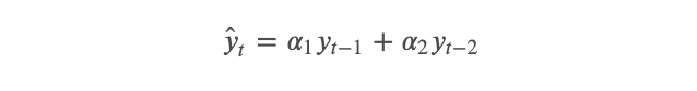 alpha_1 and alpha_2 we fit the AR model as follows:from statsmodels.tsa.ar_model import AutoRegar_model = AutoReg(X_train, lags = 2).fit()