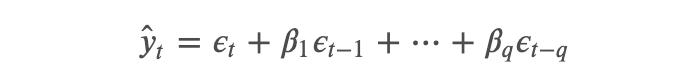 The Moving Average (MA) model assumes that the current value (y_t) is dependent on the error terms including the current error (𝜖_t, 𝜖_(t-1),…). Because error terms are random, there’s no linear relationship between the current value and the error terms.
