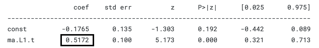 As you can see, the MA(1) model fits a beta_1 = 0.5172, which is quite close to the beta_1 = 0.5 that we have set.