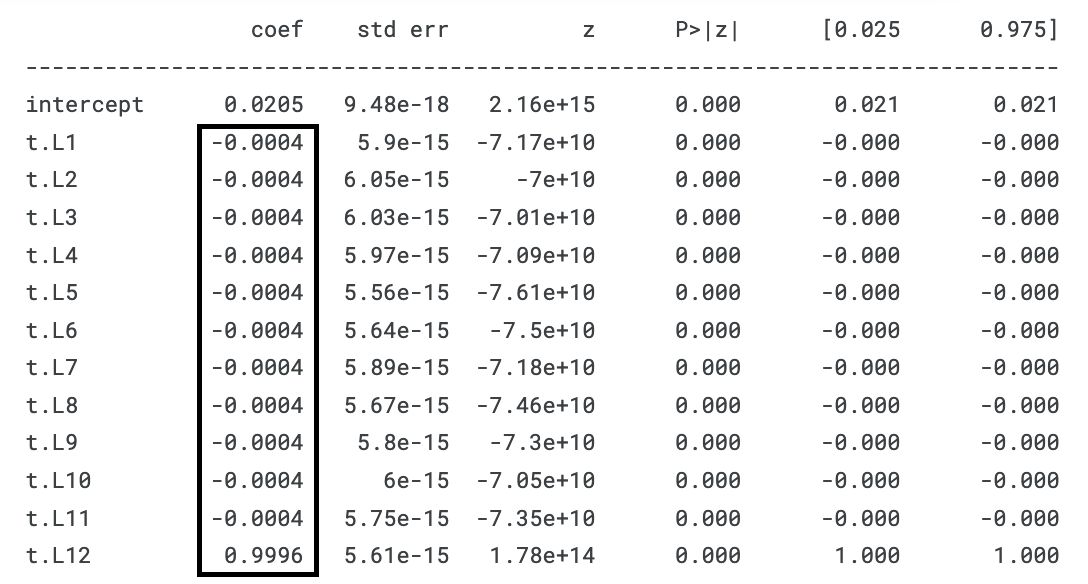 As you can see, the MA(2) model fits the parameters alpha_1..11 = -0.0004 and alpha_12 = 0.9996, which is quite close to the alpha_1..11 = 0 and alpha_12 = 1 that we have set.