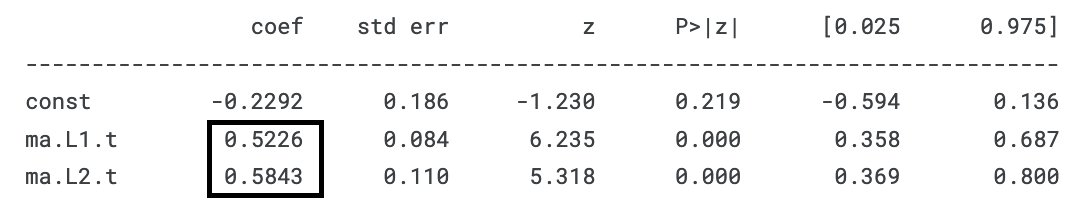 As you can see, the MA(2) model fits a beta_1 = 0.5226 and beta_2 = 0.5843, which is quite close to the beta_1 = 0.5 and beta_2 = 0.5 that we have set.