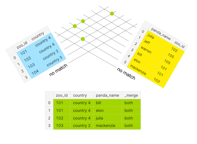 ON df1.zoo_id = df2.zoo_id;In pandas, you would use how = "inner" [2].