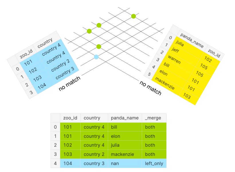indicator = True)In the below figure, you can again see the matches as described for the FULL OUTER JOIN. However, a LEFT OUTER JOIN only considers the green and blue dots as illustrated in the above panda Venn diagram. The unmatched values from the right DataFrame (yellow dots from FULL OUTER JOIN) are excluded.