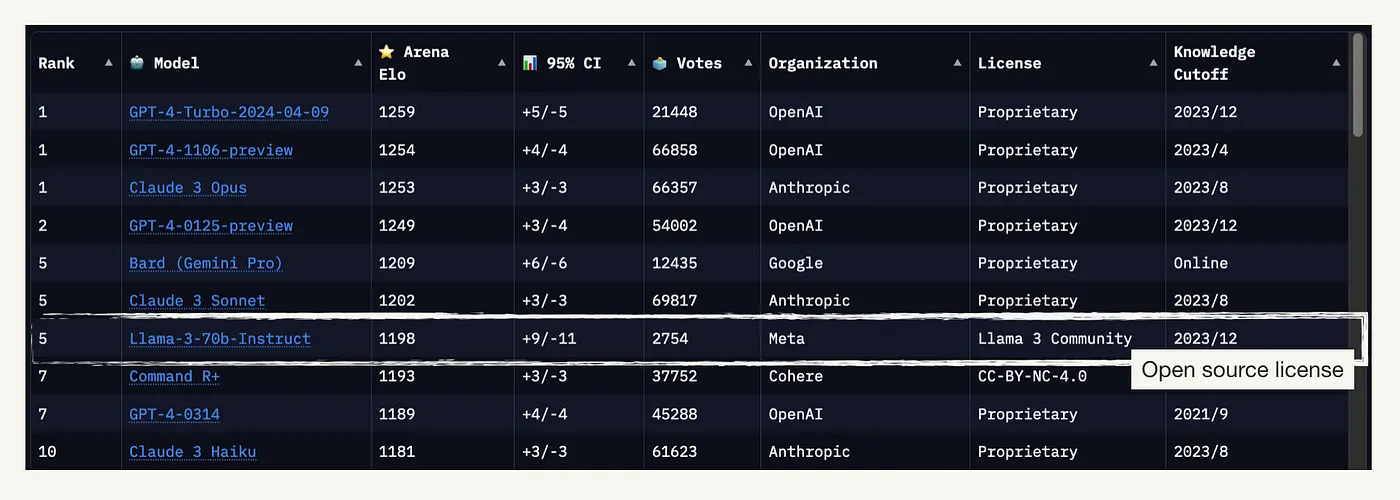 A great example of how quickly open source models are closing the performance gap is Meta’s Llama model. In March 2023, Meta decided to open source the Llama model. This has propelled advancements in the model’s capabilities: Within a month of Llama’s release, a community of tinkerers and researchers had improved the model and created various customized versions, many of which were built on top of each other. Almost one year later, Meta released Llama 3, which now ranks among the top 10 on the LMSYS leaderboard.