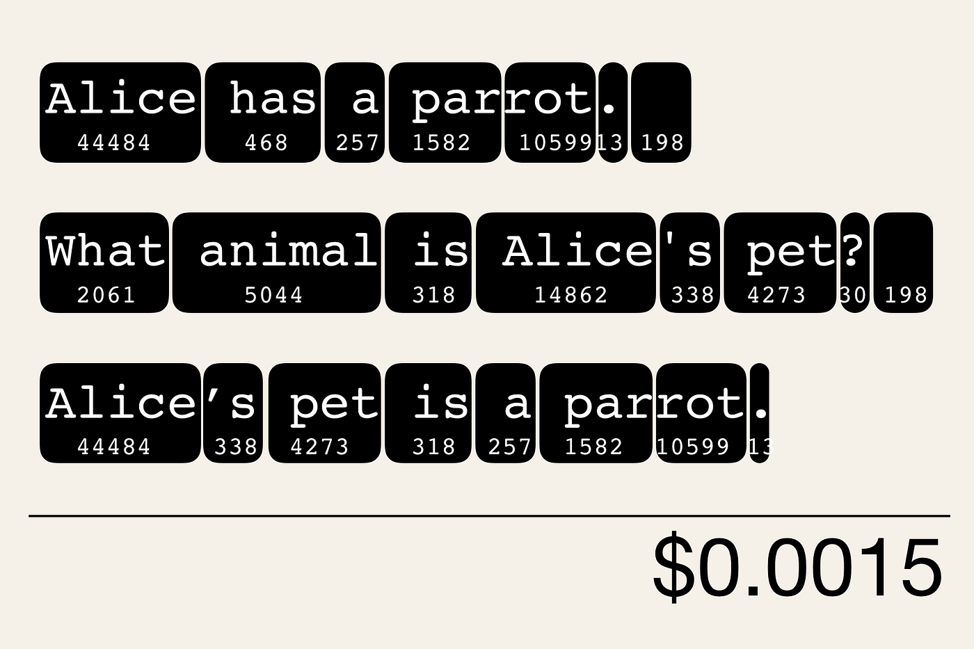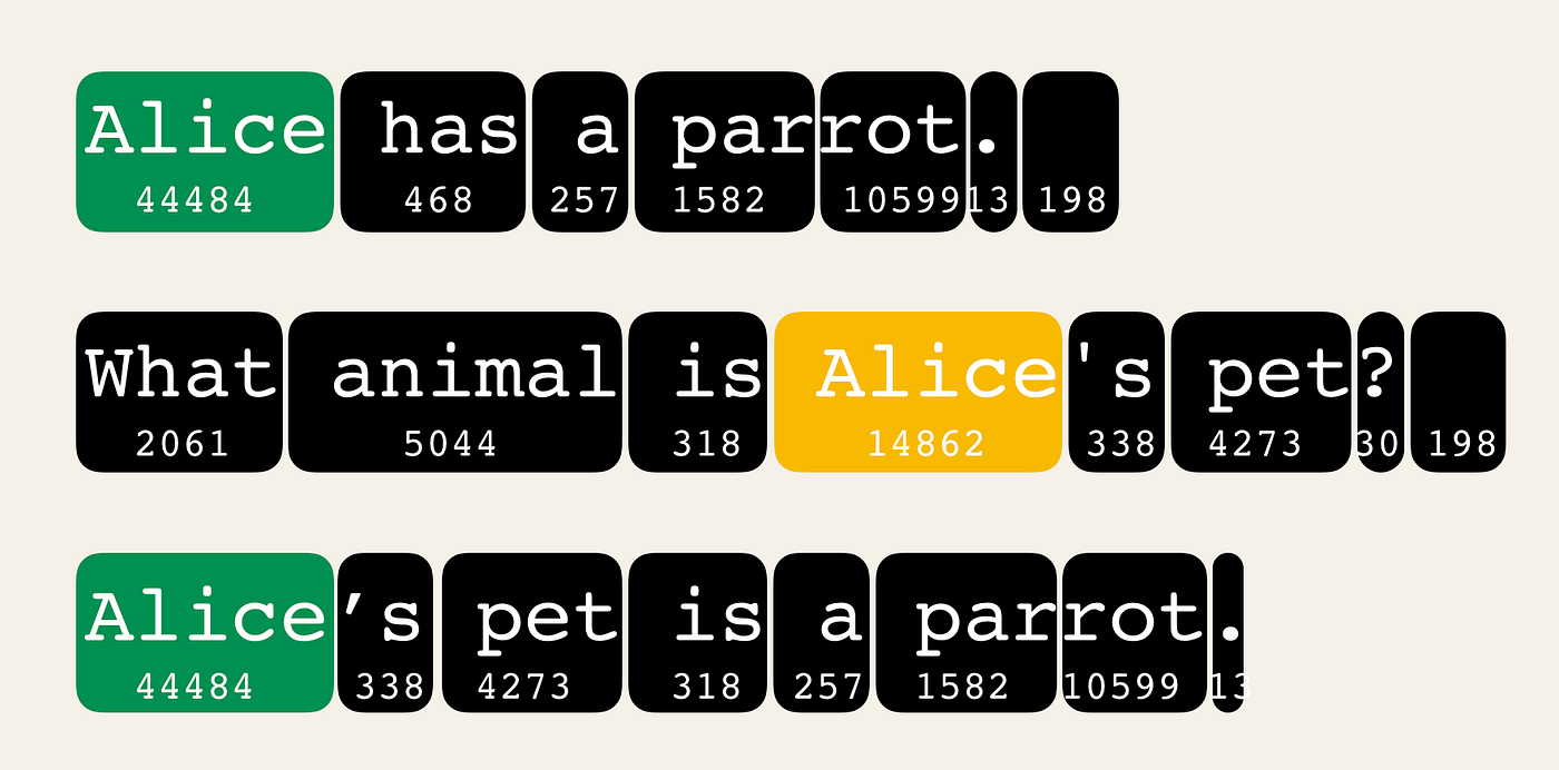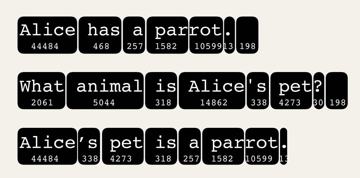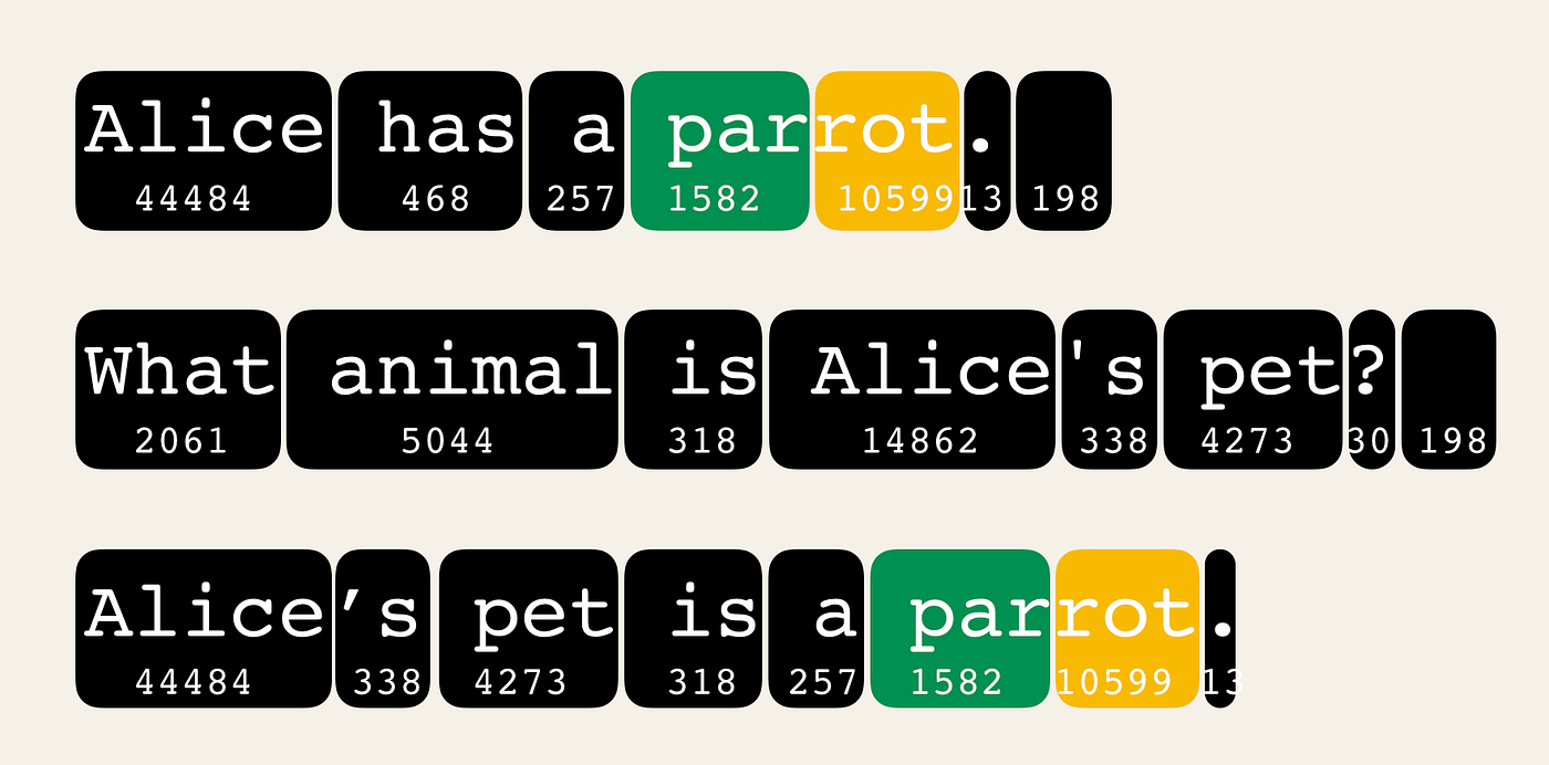decoded_text = [encoding.decode_single_token_bytes(token) for token in tokens]["Alice", " has", " a", " par", "rot", ".", "\n", "What", " animal"," is"," Alice", "'s", " pet", "?", "\n", "Alice", "'s", " pet", " is", " a", " par", "rot", "."]Summary