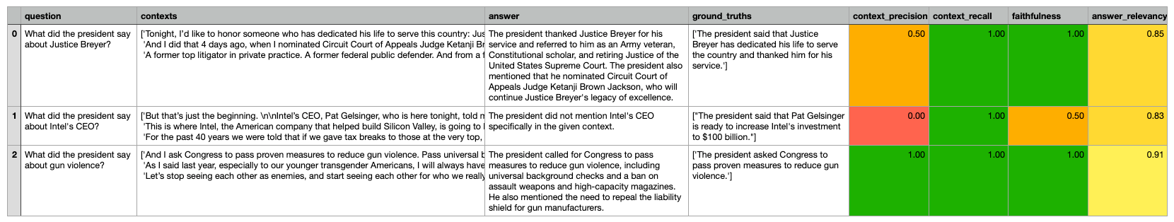 context_relevancy(signal-to-noise ratio of the retrieved context): While the LLM judges all of the context as relevant for the last question, it also judges that most of the retrieved context for the second question is irrelevant. Depending on this metric, you could experiment with different numbers of retrieved contexts to reduce the noise.context_recall(if all the relevant information required to answer the question was retrieved): The LLMs evaluate that the retrieved contexts contain the relevant information required to answer the questions correctly.faithfulness(factual accuracy of the generatednswer): While the LLM judges that the first and last questions are answered correctly, the answer to the second question, which wrongly states that the president did not mention Intel’s CEO, is judged with a faithfulness of 0.5.answer_relevancy(how relevant is the generated answer to the question): All of the generated answers are judged as fairly relevant to the questions.