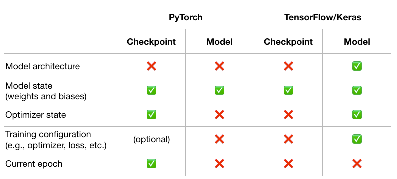 In contrast to PyTorch, a checkpoint in TensorFlow/Keras only saves the model state (weights and biases) in a checkpoint file (.ckpt) [6].