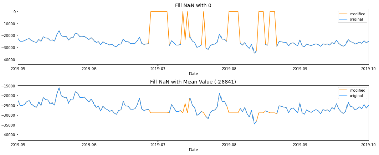 One approach is to fill missing values with a constant value with the .fillna() method. Commonly such a constant value could be the mean of the time series or an outlier value like -1 or 999. However, filling missing values with a constant value is often not sufficient.