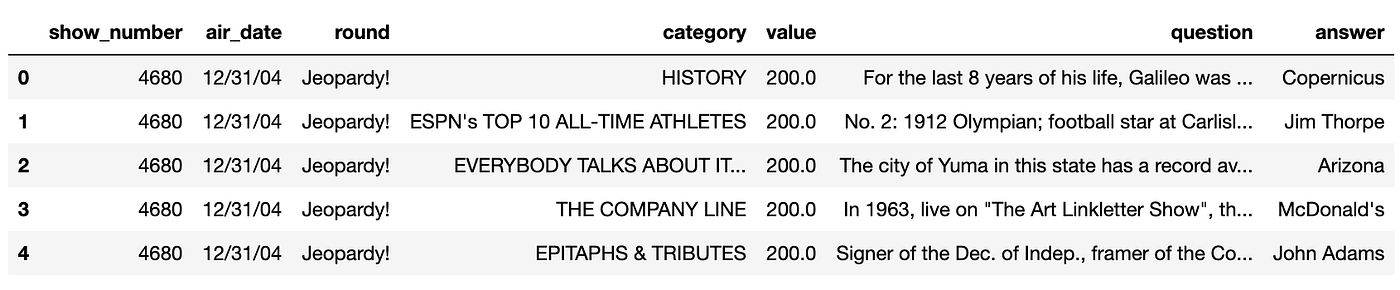 For this tutorial, we will use the first 100 rows of the 200.000+ Jeopardy Questions dataset [1] from Kaggle.