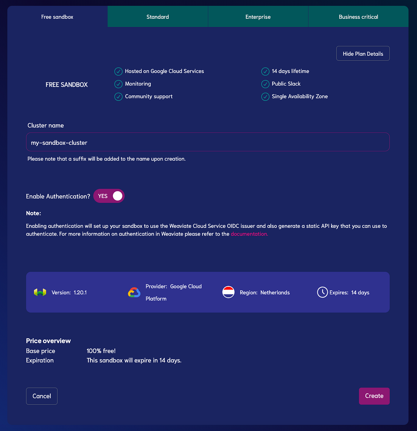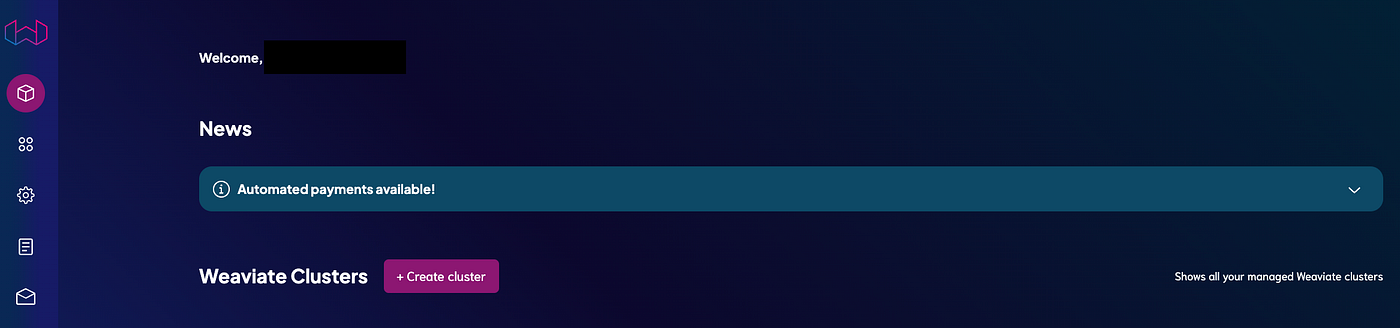 Once you are registered, you can create a new Weaviate Cluster by clicking the “Create cluster” button.