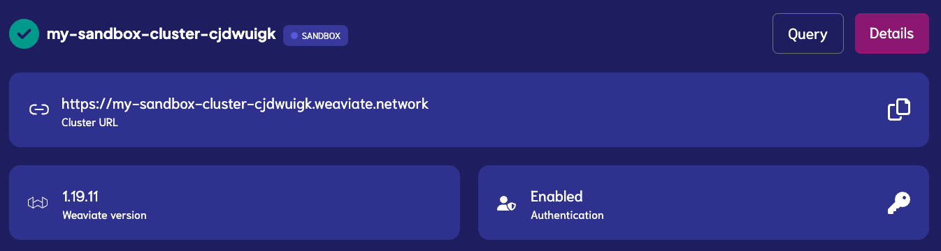 url="https://<your-sandbox-name>.weaviate.network", # Replace w/ your Weaviate cluster URL