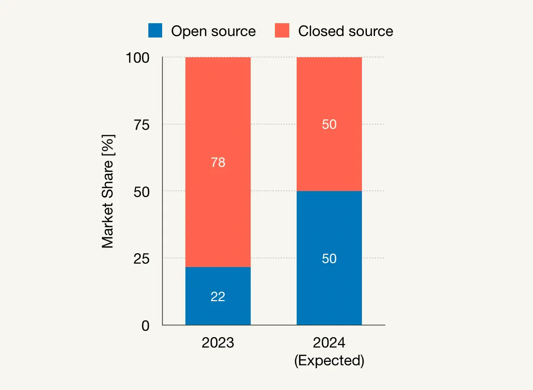 However, smaller open source models have been gaining popularity and could soon replace larger closed source ones. Mainly because the capabilities of open source LLMs are catching up. The main advantage of closed source models, performance, is now quickly diminishing. Additionally, the aforementioned survey respondents listed other factors, such as data security, customizability, and cost, which are making open source LLMs a more attractive alternative to closed source LLMs in enterprises. Some enterprise AI decision makers are even targeting a 50/50 split for the coming year, according to the same survey [1]. Thus, we can already expect a significant shift toward use cases deployed on smaller open source models in 2024.